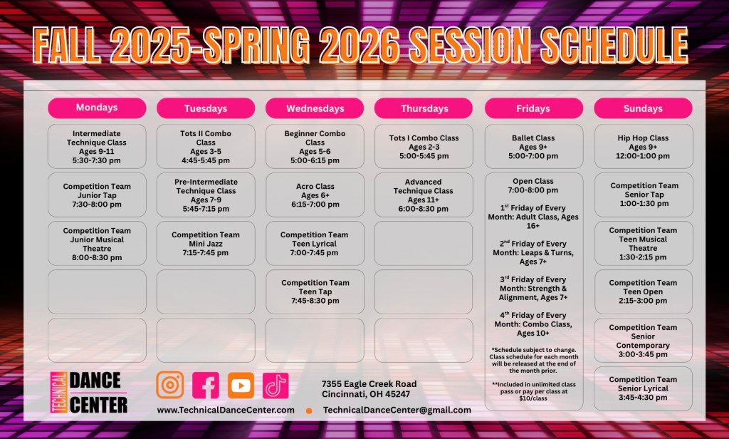 Fall 2025-Spring 2026 Class Schedule Our Fall 2025-Spring 2026 session will begin on Monday, September 15th and run through May 15th, 2026.
